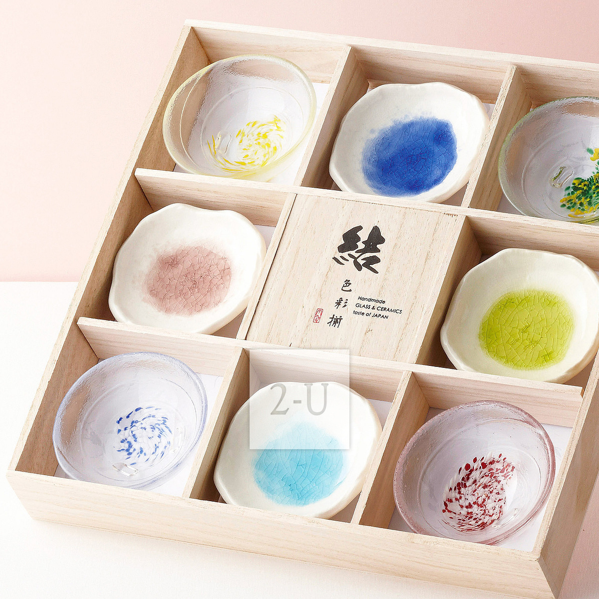 商品 : 陶瓷小碗碟 (約8.5x8.5xH2.8cm) x 4, 玻璃小碗碟 (約Φ8.5xH3cm) x 4 材質 : 陶瓷, 鈉玻璃 包裝盒 : 約30.5 x 30.5 x 4.5 cm, 約1.3kg 陶瓷小碗碟/日本製, 玻璃小碗碟/中國製