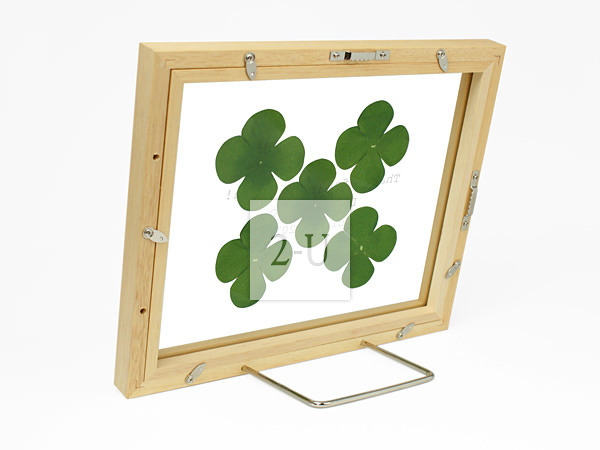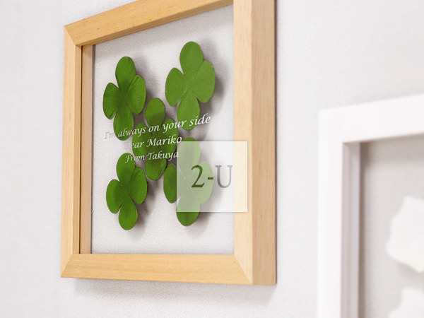 三葉草的花語就是:倖福。傳說中,如果誰找到暸有四瓣葉片的三葉草,即四葉草 (也稱倖運草),誰就會得到倖福。倖運三葉草立體畫框由有四片葉子的三葉草拼成。是代錶倖福的自然派室內裝飾用立體畫框。畫框前後兩面玻璃都透明,中間的三葉草是倣真草,不會枯萎。掛在墻上如同四片葉子的三葉草浮在墻上一般,有逼真感。可以彫刻各種各樣的祝福語。室內同時擺兩個、三個立體畫框裝飾也時尚。