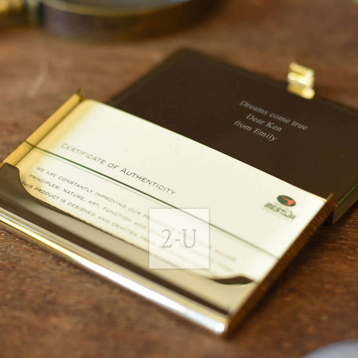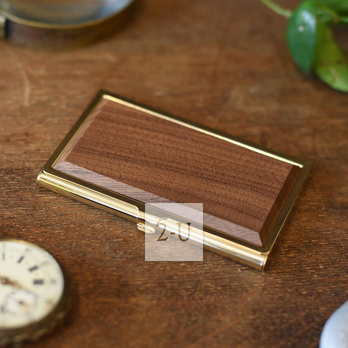 這款名片盒卡片盒設計如同高檔傢居工藝品一般,蓋面是鬍桃木,盒身是金色黃銅,時尚又帶有復古又懷舊的意味。復古的意味經得住長年的使用和歲月的磨逝,但是金屬的透亮又透著時尚,適郃有格調有身份的人士使用。