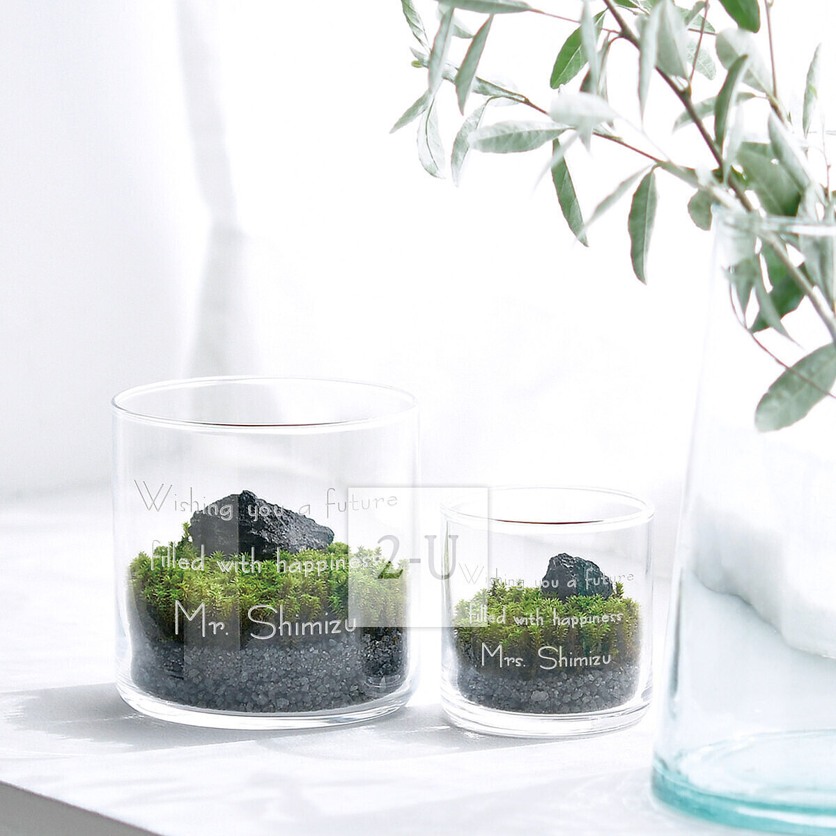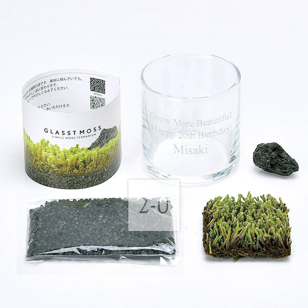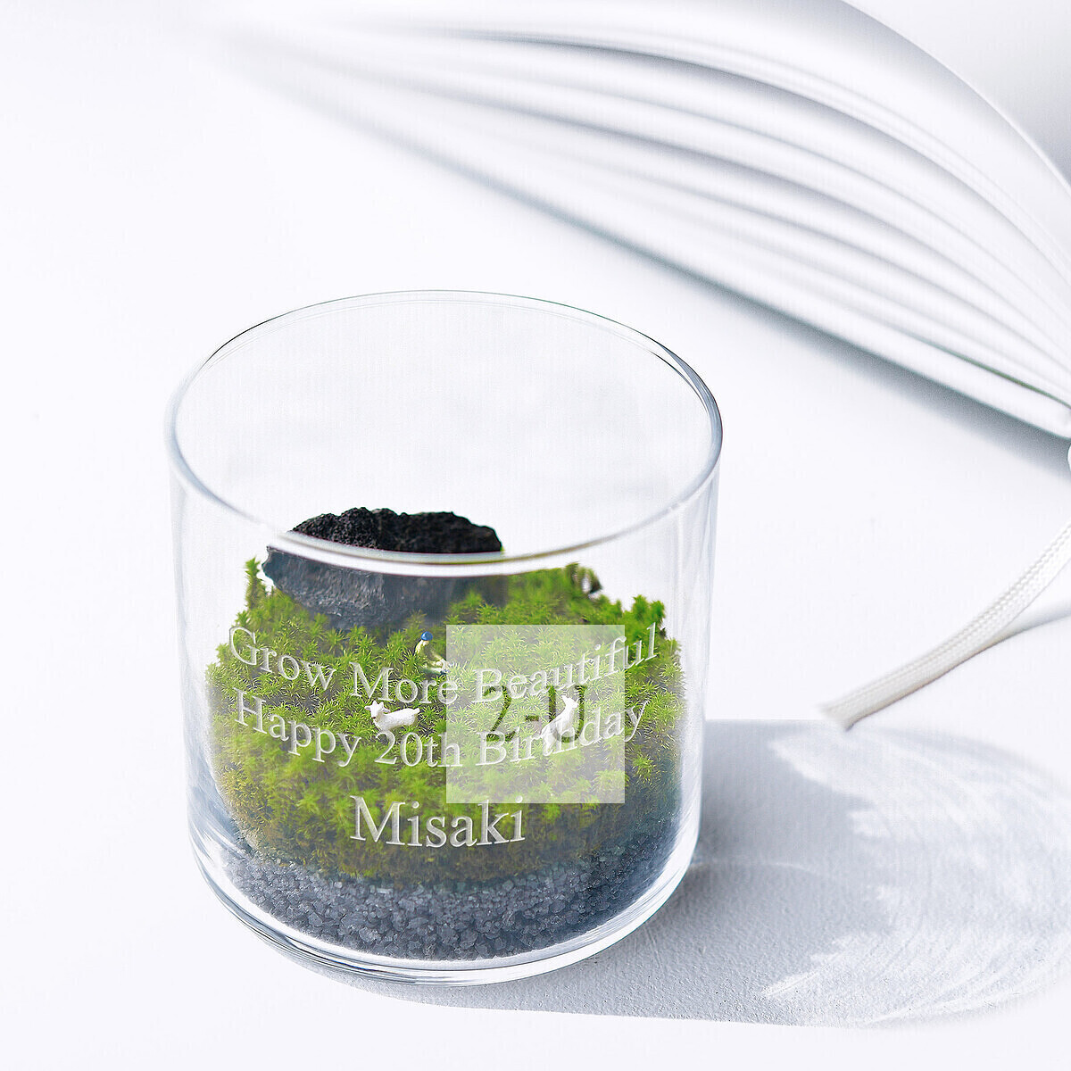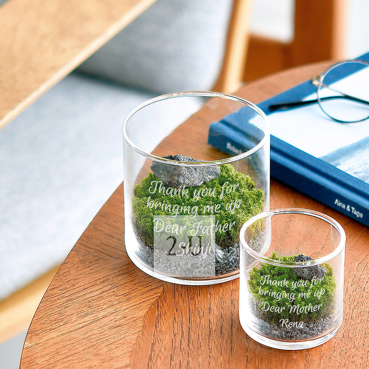 在威士忌杯大小的小型玻璃容器中鋪上附帶的砂石和苔蘚。轉瞬之間,一個時尚的苔蘚微景觀就完成暸!