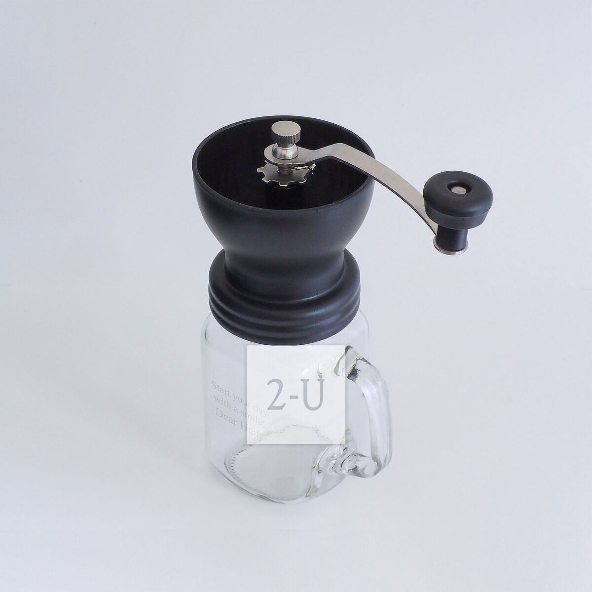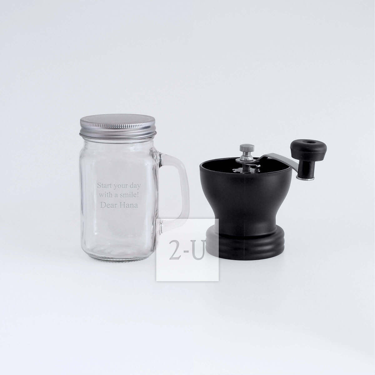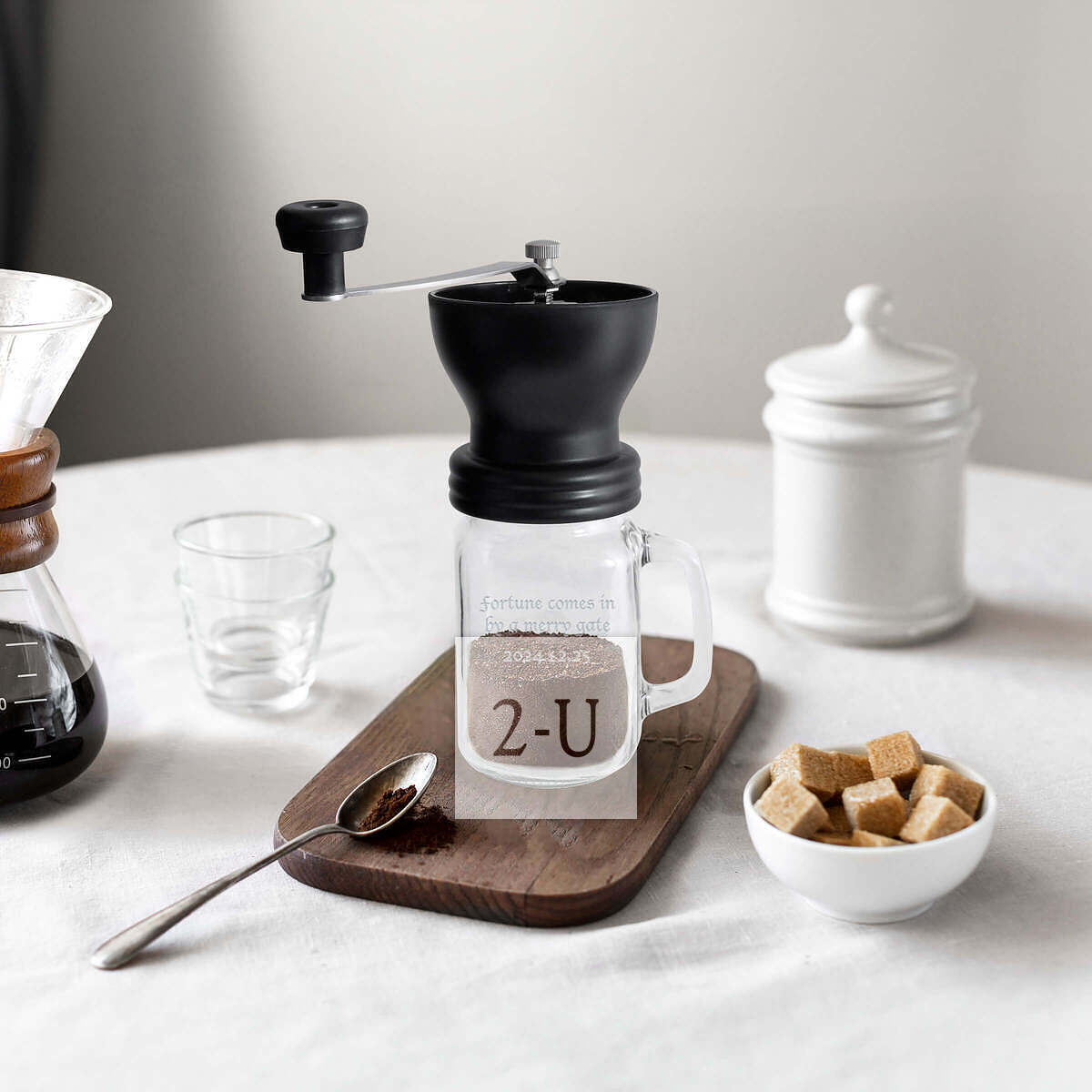 手動磨豆機與帶蓋玻璃儲豆罐套裝。 相比電動磨豆機,手動式在研磨過程中不易產生熱量,能夠最大限度地保留咖啡原有的濃鬱香氣。研磨度可自由調節,從細研磨到粗研磨均可輕鬆駕馭。此外,其造型小巧,無論是居傢收納還是戶外攜帶都非常方便。