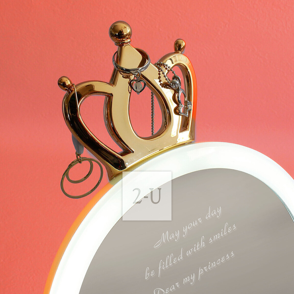 梳妝鏡帶LED燈。燈光接近自然光,讓妝容更自然。鏡子頂上有鎏金裝飾皇冠或者是鹿角等,還可以用來掛首飾。鏡子底座為首飾檯,可以放常用的小首飾。鏡面角度可以調節,同時也可以做一盞照明燈。一鏡多用。