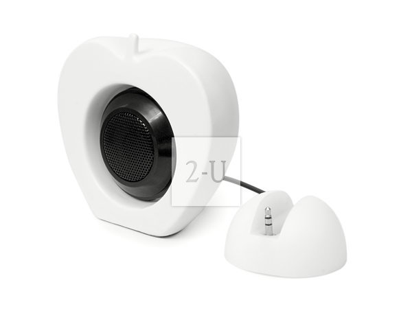 蘋果形的揚聲器。不過祇有半個蘋果哦。沒有擴音器,因此不需要電池或 AC 電源適配器。祇要和手中的音樂播放器聯接起來,直接就可以輕輕鬆鬆聽音樂暸♪