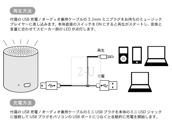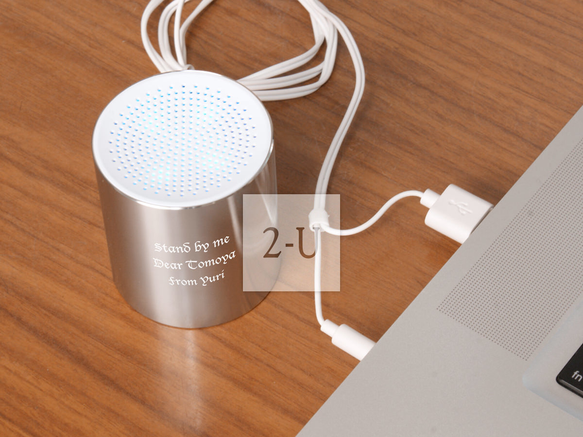 形狀特別的音箱喇叭。金屬鋁的光澤與音樂相配更添光澤。 可便攜的輕巧設計可以讓讓音樂伴隨左右。怡然自得儘情傾聽悅耳的音樂。 小圓柱音箱通過 USB 接頭充電。充電30分鐘可以使用約2-3小時。 可根據您的要求在正面約25x25mm的範圍內印上信息等。